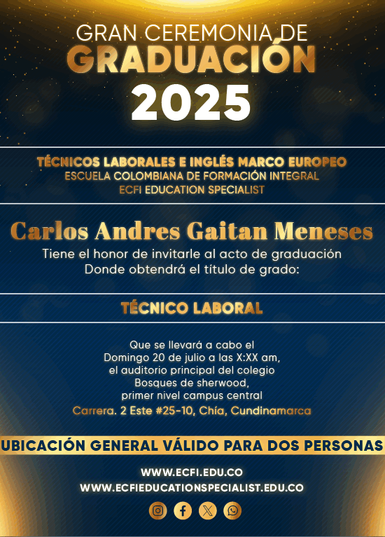 Se informa a los estudiantes que el envío de invitaciones para la ceremonia de grado se llevará a cabo durante los días 17, 18 y 19 de diciembre de 2025 . Las invitaciones incluyen el ingreso de dos personas . En caso de requerir entradas adicionales, estas podrán ser adquiridas por el estudiante.